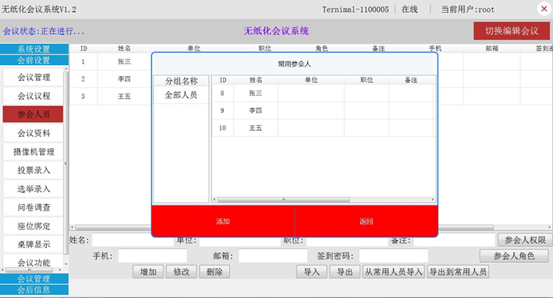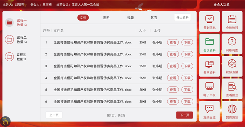 1.會前準(zhǔn)備:會前準(zhǔn)備包含會議室預(yù)約及管理,同時對確定的會議室設(shè)備進(jìn)行開會前資料上傳,席位的準(zhǔn)備及參會人員名字的錄入等。